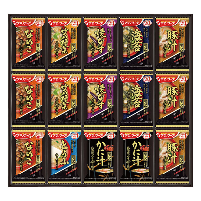 いつものおみそ汁贅沢(なめこ、豚汁)×各6食、(焼なす、炒め野菜、海苔、かに汁)×各4食、いつものおみそ汁贅沢とうふ × 2食