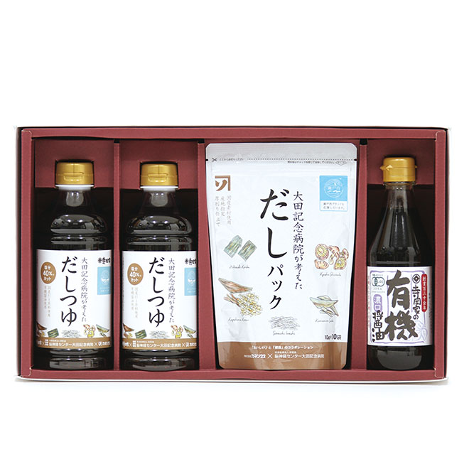 大田記念病院が考えただしつゆ500ml×2、大田記念病院が考えただしパック(10g×10袋)×1、寺岡家の有機醤油濃口300ml×1