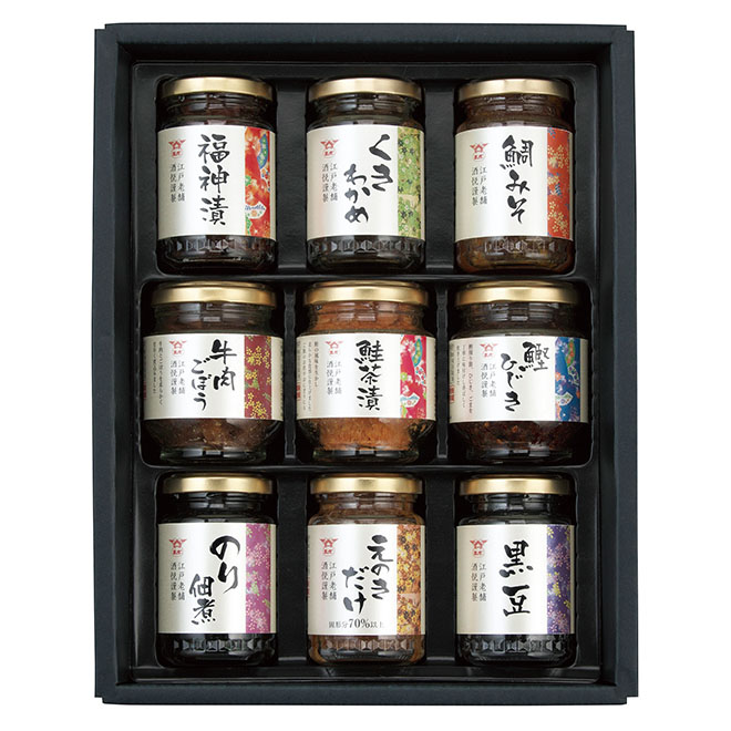 福神漬90g、くきわかめ75g、鯛みそ100g、牛肉ごぼう55g、鮭茶漬60g、鰹ひじき40g、のり佃煮95g、えのきだけ90g、黒豆100g