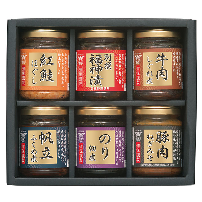 別撰福神漬120g、のり佃煮125g、紅鮭ほぐし85g、牛肉しぐれ煮70g、豚肉ねぎみそ125g、帆立ふくめ煮120g(固形量55g)