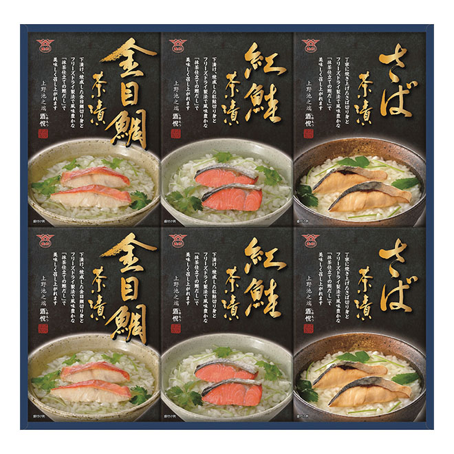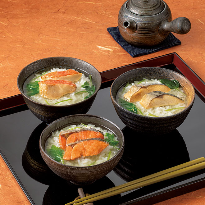 金目鯛茶漬21.3g(具材18g、お茶漬の素3.3g)、紅鮭茶漬21.3g(具材18g、お茶漬の素3.3g)、さば茶漬16.3g(具材1袋、お茶漬の素1袋) 各×2