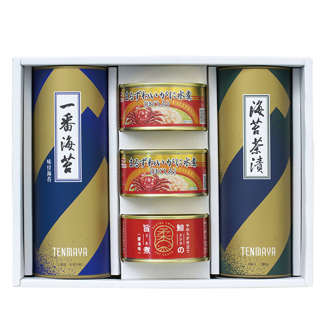 「一番摘み」使用の味付海苔、海苔がたっぷり入ったお茶漬、カニ缶詰、鯨の旨煮缶詰との詰合せです。