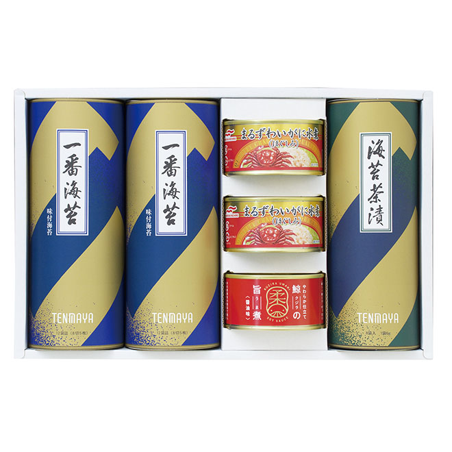 「一番摘み」使用の味付海苔、海苔がたっぷり入ったお茶漬、カニ缶詰、鯨の旨煮缶詰との詰合せです。