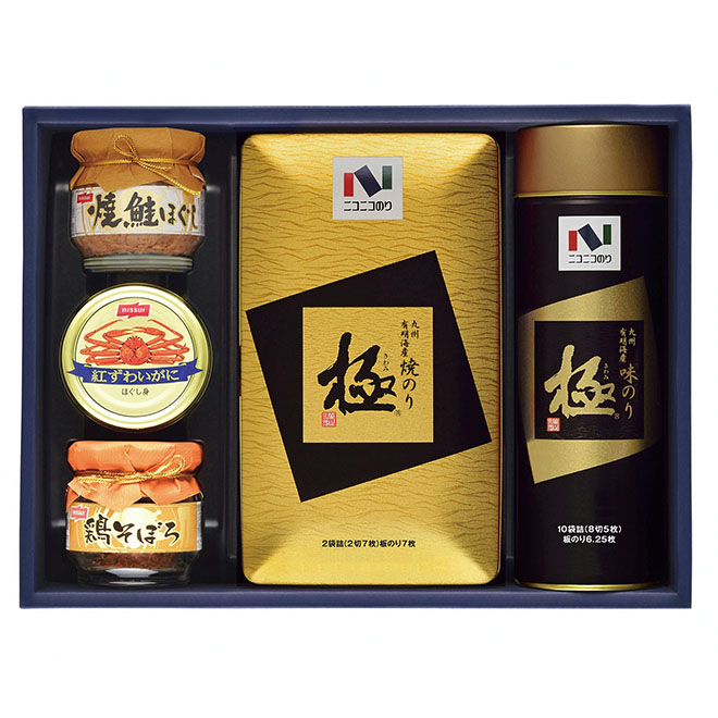 味のり丸缶 10袋詰(8切5枚)板のり6.25枚、焼のり半裁缶 2袋詰(2切7枚)板のり7枚、紅ずわいがにほぐし身55g、焼鮭ほぐし瓶(50g)、鶏そぼろ瓶50g