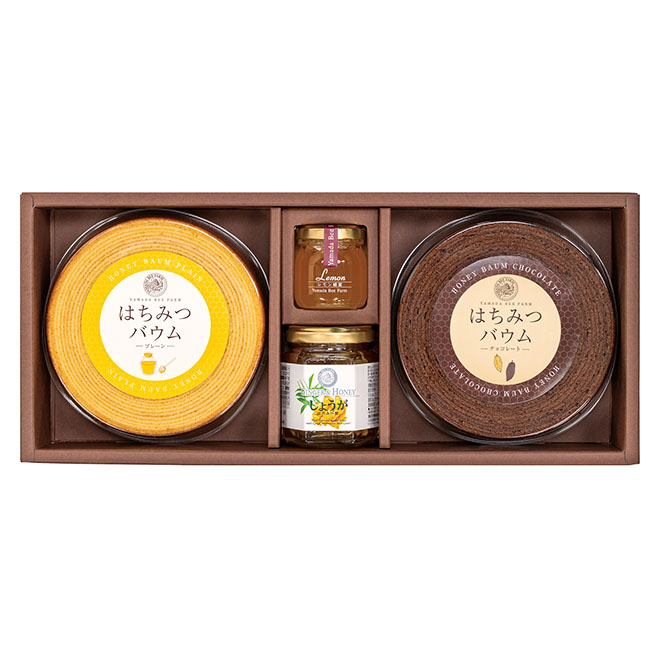 はちみつバウム(プレーン)1個、はちみつバウム(チョコレート)1個、レモン蜂蜜50g×1、しょうが蜂蜜漬120g×1