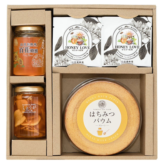 はちみつ紅茶2g×10、ルーマニア産百花蜂蜜200g×1、しょうがはちみつ漬200g×1、はちみつバウム(プレーン)1個