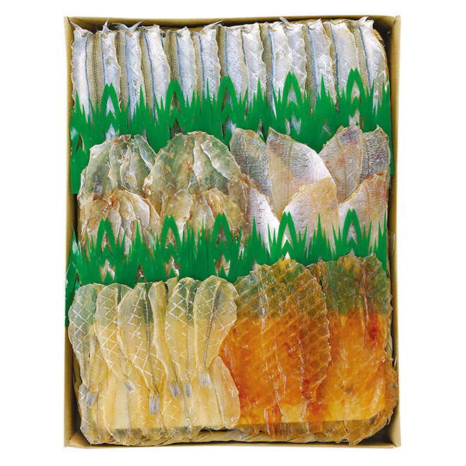 きす味干 25g、かわはぎ塩干 40g、さより味醂干 25g×2、鯛味醂干 25g、ふく味醂干 25g