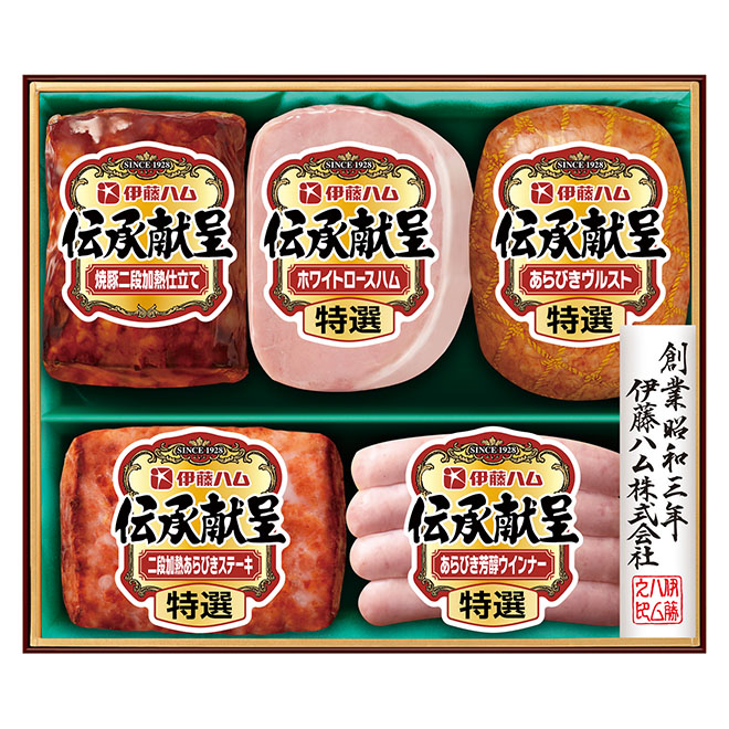 焼豚二段加熱仕立て160g、特選ホワイトロースハム180g、特選あらびきヴルスト160g、特選二段加熱あらびきステーキ110g、特選あらびき芳醇ウインナー80g