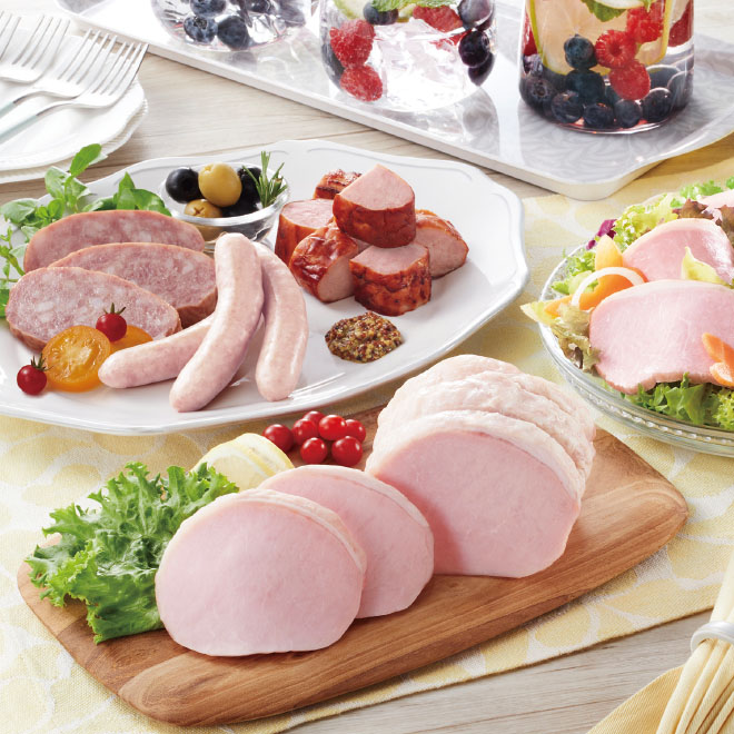 特選ホワイトロースハム320g、焼豚二段加熱仕立て160g、特選燻しあらびきヴルスト160g、特選炙り焼あらびき黒胡椒ポーク160g、特選あらびき芳醇ウインナー80g×2