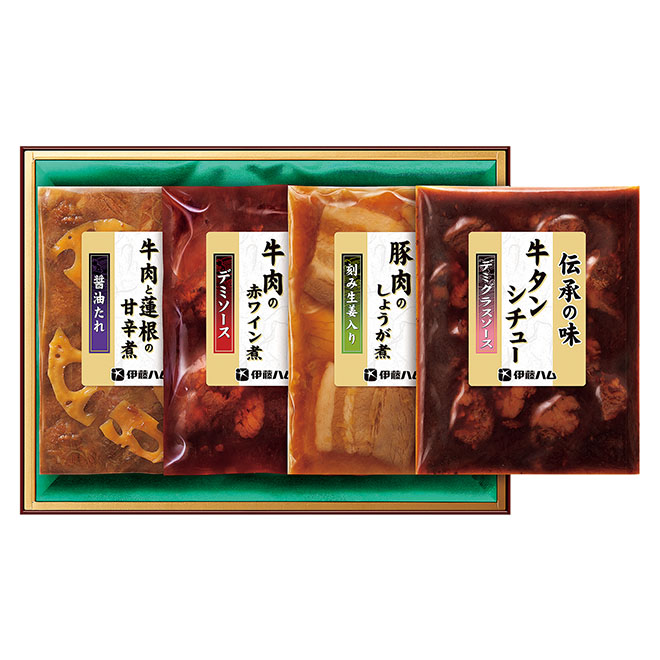 牛肉の赤ワイン煮デミソース180g、牛タンシチュー デミグラスソース170g、豚肉のしょうが煮130g、牛肉と蓮根の甘辛煮120g