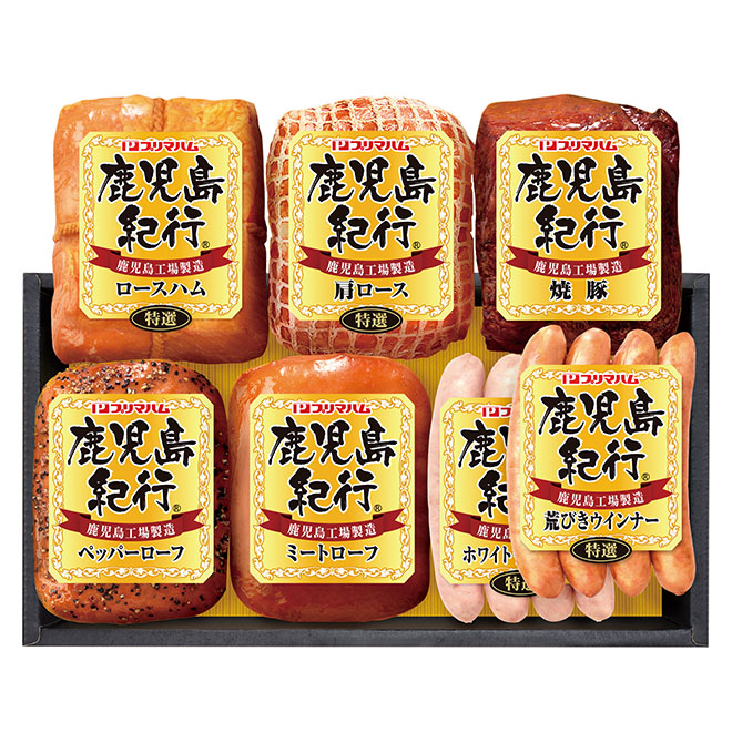 特選ロースハム250g、特選肩ロース180g、焼豚180g、ペッパーローフ140g、ミートローフ140g、特選荒びきウインナー80g、特選ホワイトウインナー80g