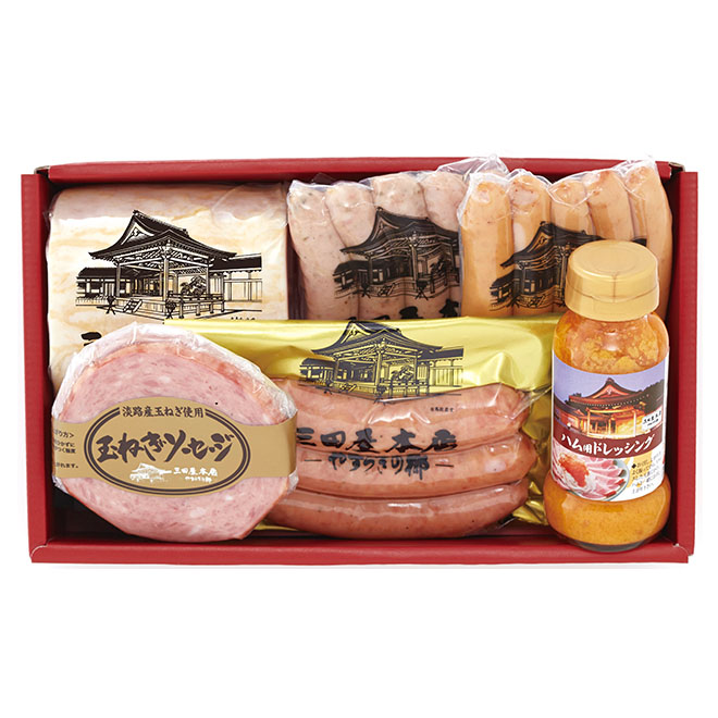 能舞台のある三田屋本店ステーキレストランで提供しているロースハム。ドイツ仕込みの製法を踏襲しながら、日本人の味覚にあわせてひとつひとつ丹念に仕上げたロースハムギフトです。三田屋本店定番のロースハムとハム用ドレッシングに加えて、ソーセージを4種お楽しみいただけるバラエティセットです。