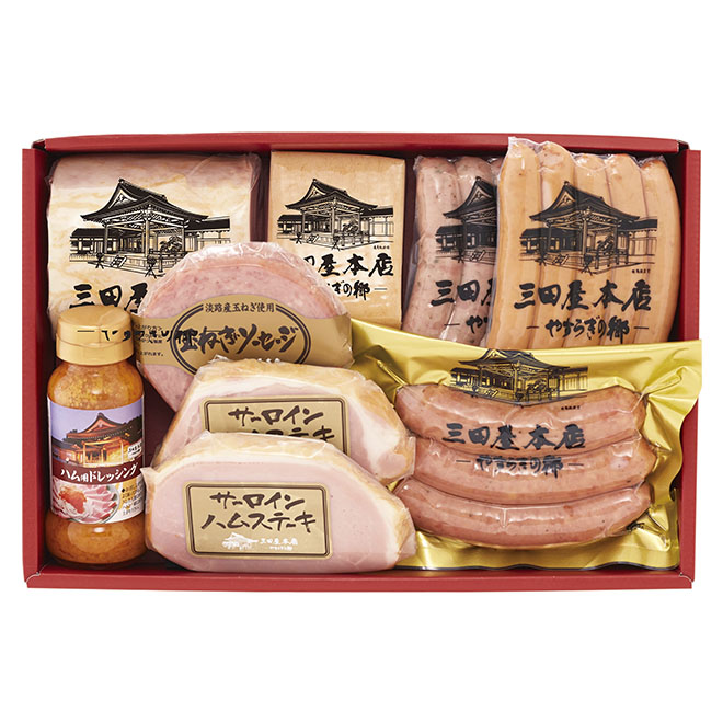 ドイツ仕込みの製法を踏襲しながら日本人の味覚にあわせて丹念に仕上げたロースハムギフトです。薄くスライスした玉ねぎに、 ハム用ドレッシングをかけ、 ハムで巻いてお召し上がりいただければ、三田屋本店レストランのハムオードブルをご家庭でお手軽にお楽しみいただけます。その他にお料理に便利なベーコン、サーロインハムステーキ、3種のソーセージをお楽しみいただける豪華なバラエティセットです。