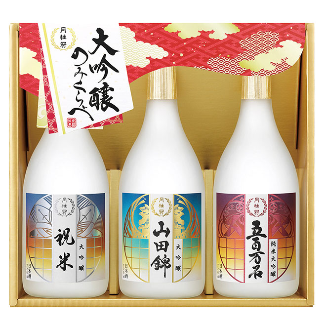 酒造好適米の五百万石・山田錦・祝(いわい)をそれぞれ100%使用して醸した3種類の大吟醸酒を詰め合わせました。大吟醸ならではの贅沢な香りと、酒米ごとの味わいの違いを飲みくらべていただけます。「五百万石純米大吟醸」は軽やかな香りとすっきりとしたキレ味、「山田錦大吟醸」は華やかで甘美な香りを持つ気品ある味わい、「祝米大吟醸」は上品な香りとふくらみのある味わいが特徴です。