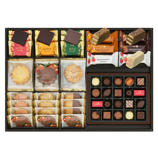 ファンシーチョコレート、ミルフィーユ、クッキーなど、選んで食べる楽しさを贈るギフトセットです。