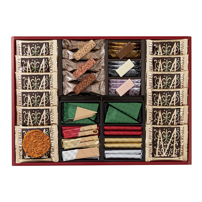 エコルセ 三角3枚×4包、短冊2枚×4包、丸型(ミルクチョコ2本×4包、ホワイトチョコ2本×4包) マンデルチーゲル12枚 米粉クランチ ラズベリーチョコ1個、ミルクチョコ2個、ホワイトチョコ2個 ショコラエコルセ ミルクチョコ3枚、ホワイトチョコ3枚、ストロベリーチョコ3枚
