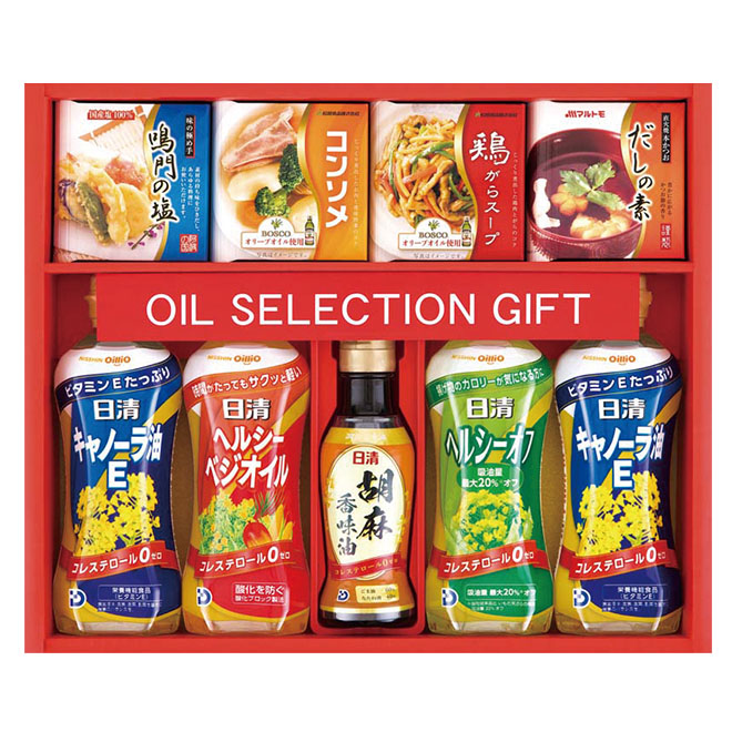 日清(ヘルシーオフ350g・ヘルシーべジオイル350g・キャノーラ油E350g×2・胡麻香味油145g)、鳴門の塩80g、マルトモだしの素(4g×6袋)、鶏がらスープ(20g×2袋)、コンソメ(20g×2袋)