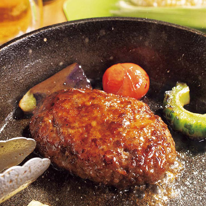お肉は自社農場で繁殖、肥育した宮崎牛だけを使用。その宮崎牛の様々な部位を独自の配合で混ぜ合わせた宮崎牛100%のハンバーグはまさにステーキのようなにくにくしさが味わえます。