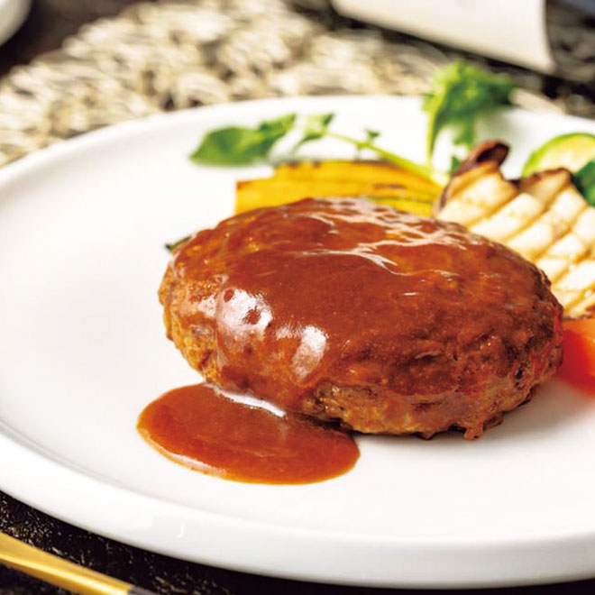 しっかり焼き目をつけ、中にお肉の旨みを閉じ込めたデミグラスソースハンバーグです。