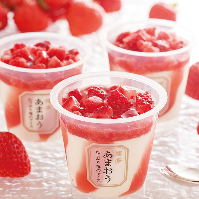 いちごの王様、博多あまおうのソースが入ったアイスの上に、ごろっと果肉をのせた、旬の味と素材感をたっぷり楽しめる、まさにいちご尽くしのアイスです。