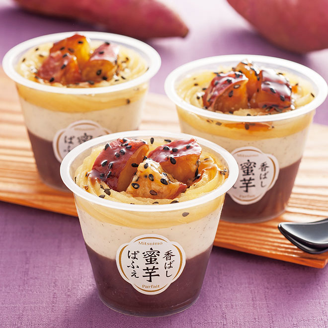 甘くねっとりとした「紅はるか」の焼き芋を使った、芋好きにはたまらないスイーツ。紅はるかの角切りとペーストの下には、滑らかな芋プリン、そして上品な甘さの餡の3層仕立て。みたらしソースが芋の香ばしい風味をさらに引き立てます。