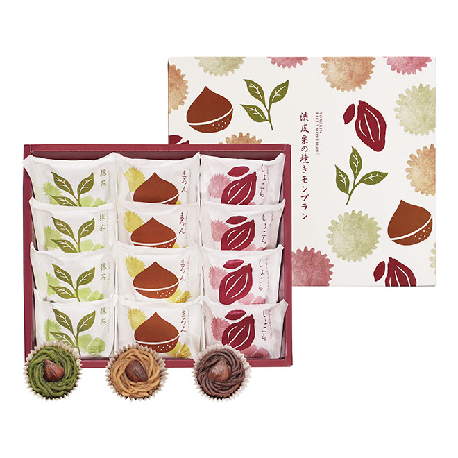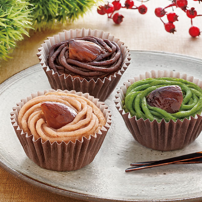 しっとりした食感の渋皮栗を使った栗・抹茶・チョコの3種の焼きモンブランです。ほっこりとしたひとときをお過ごしください。