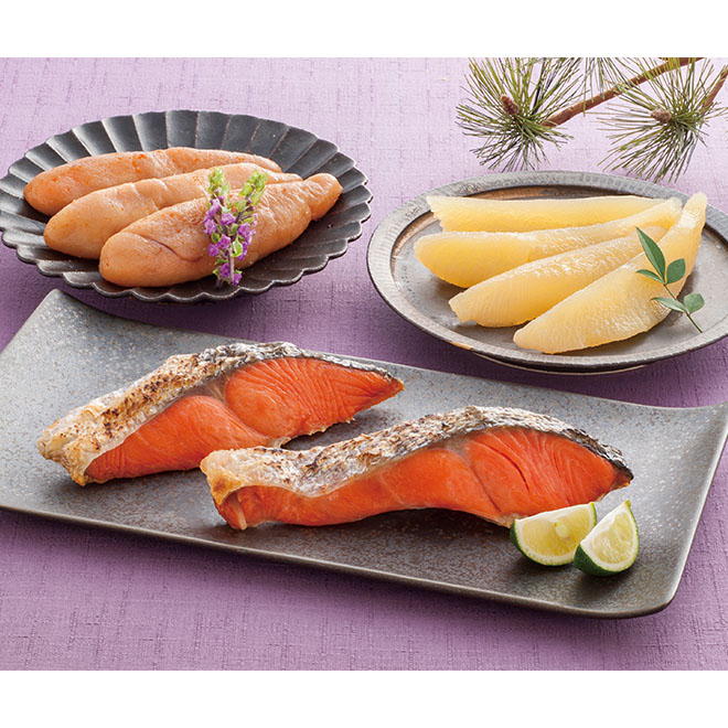 脂がのった紅鮭、北海道で味付けされた数の子、博多加工の無着色明太子。北と南の美味が見事に饗宴した、贅沢な詰め合わせです。
