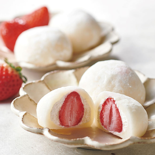 もち粉とうるち粉をブレンドしたやわらかく伸びのある大福で、ホイップクリームと福岡県産あまおうを1粒包み込みました。やわらかいお餅の食感といちごの酸味、やさしい甘さのクリームが1つになった味わいのバランスをお楽しみください。