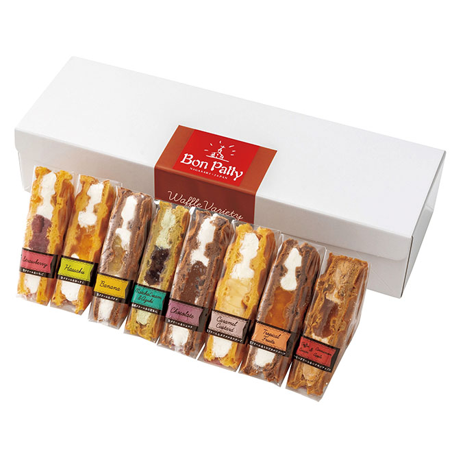 生クリーム&いちご・生クリーム&はっさく・生クリーム&カラメルカスタード・コーヒークリーム&シナモンアップル・抹茶クリーム&小豆あん・生クリーム&ショコラ・生クリーム&バナナ・生クリーム&トロピカルフルーツ×各1 計8