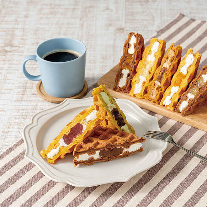 彩りも鮮やかなふんわりワッフル。ふんわり仕上げた香ばしいワッフル生地に、フルーツのジャムやクリームをサンド。味わいも彩りも鮮やかなワッフルを詰合わせました。
