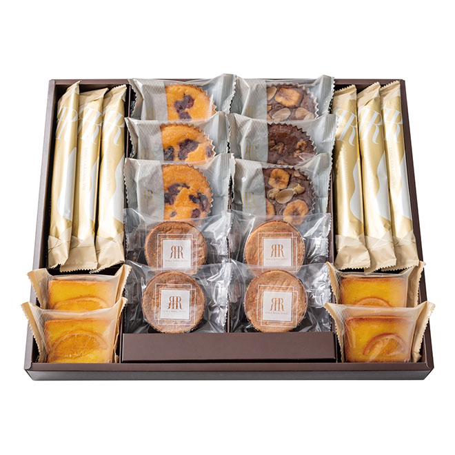 しっとり生地にフルーツやナッツを飾ったプチケーキやオレンジケーキ、さくっとした食感の中にキャラメルの風味が香る少し長いサイズのロングパイ、アーモンドが香ばしく香るフランス伝統の厚焼きクッキーと、ホテルの豊かなティータイムを演出するスイーツを詰め合わせました。
