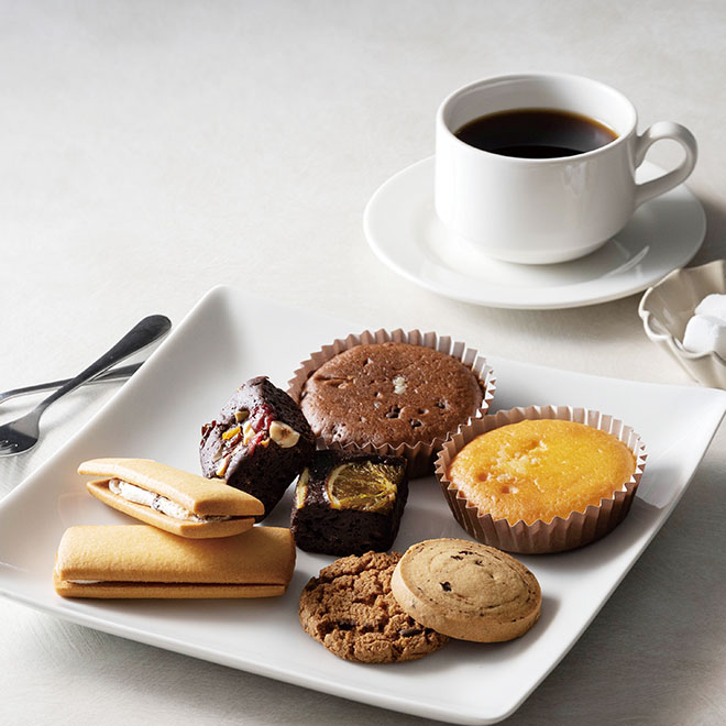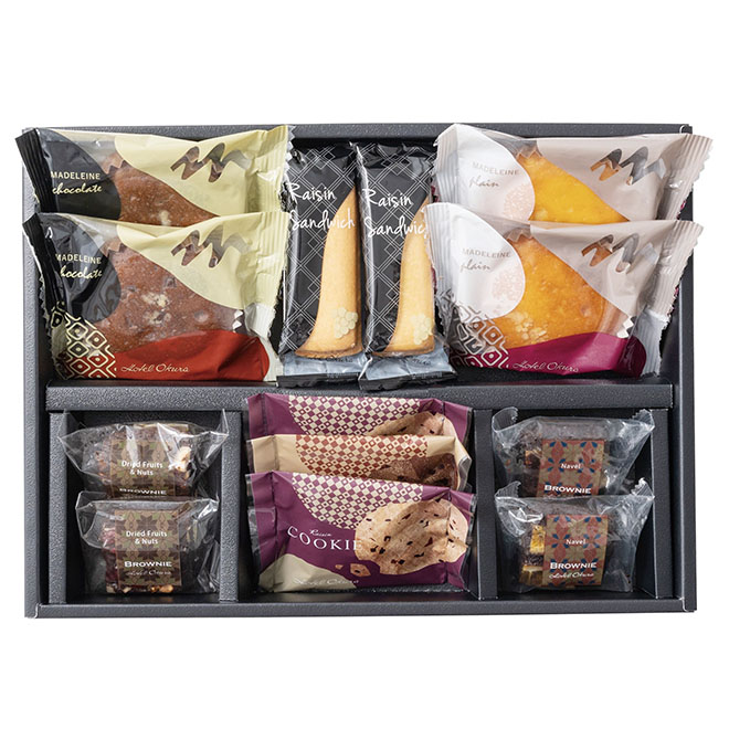 ブラウニー(ネーブル・ドライフルーツ&ナッツ)・レーズンサンド・マドレーヌ(プレーン・チョコ)・レーズンクッキー×各2、チョコチップクッキー×1