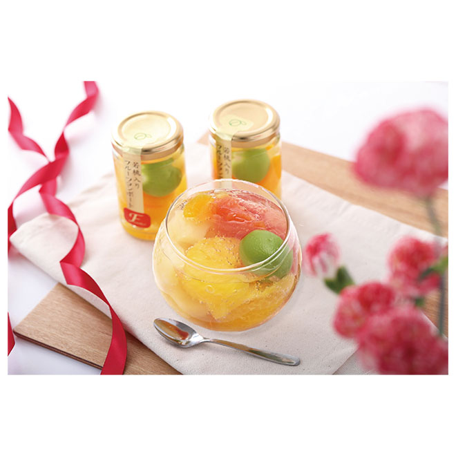 温州みかん、パイン、甘夏、ルビーグレープフルーツ、若桃。いろんな種類のフルーツがたくさん入った見た目も鮮やかなコンポート。