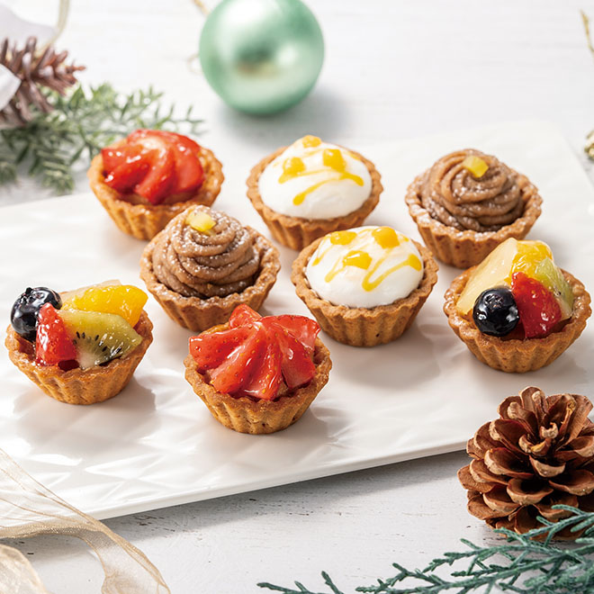 プチサイズのタルトに甘さ控えめのクリームやムース、色とりどりのフルーツを飾ったフルーツタルトの詰合せです。