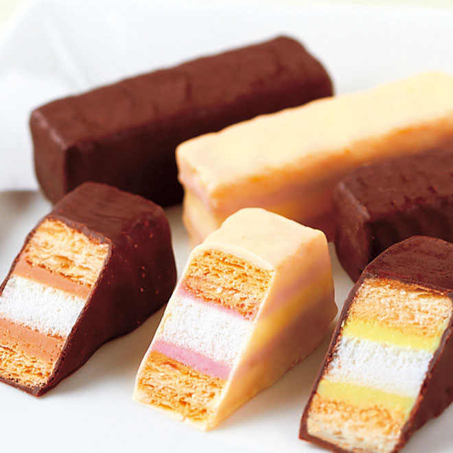 薄く香ばしく焼き上げた折り込みパイとさっくり焼き上げたメレンゲに、3種の風味豊かなクリームをサンドしました。