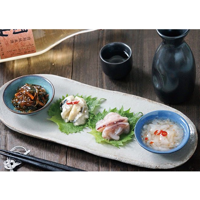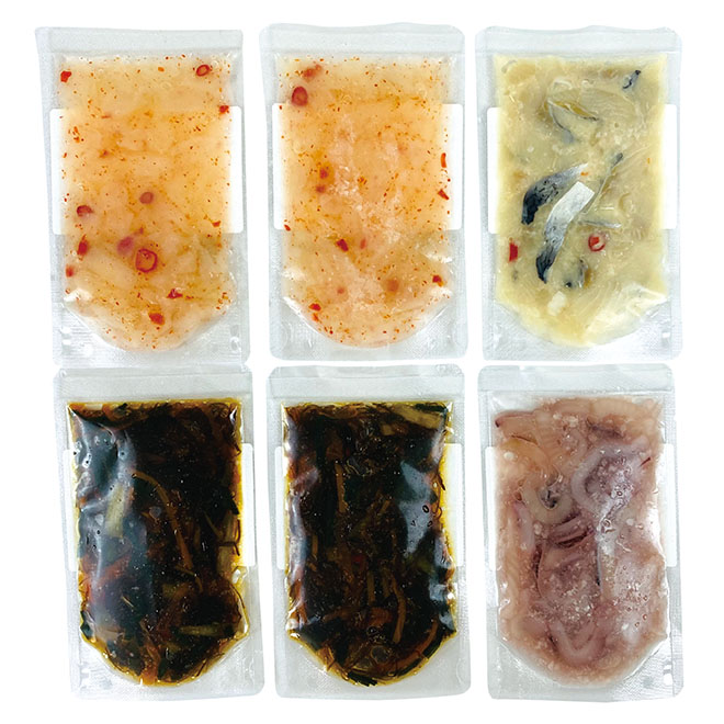 帆立塩辛60g×2、北の華松前55g×2、にしん切込み55g×1、いか糀造り60g×1