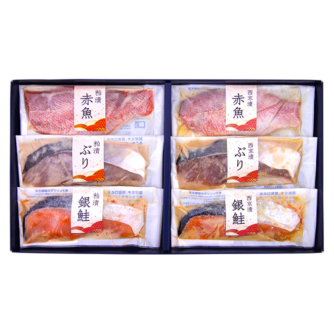 赤魚粕漬、銀鮭粕漬、ぶり粕漬、赤魚西京漬、銀鮭西京漬、ぶり西京漬 各60g×1切 計6切