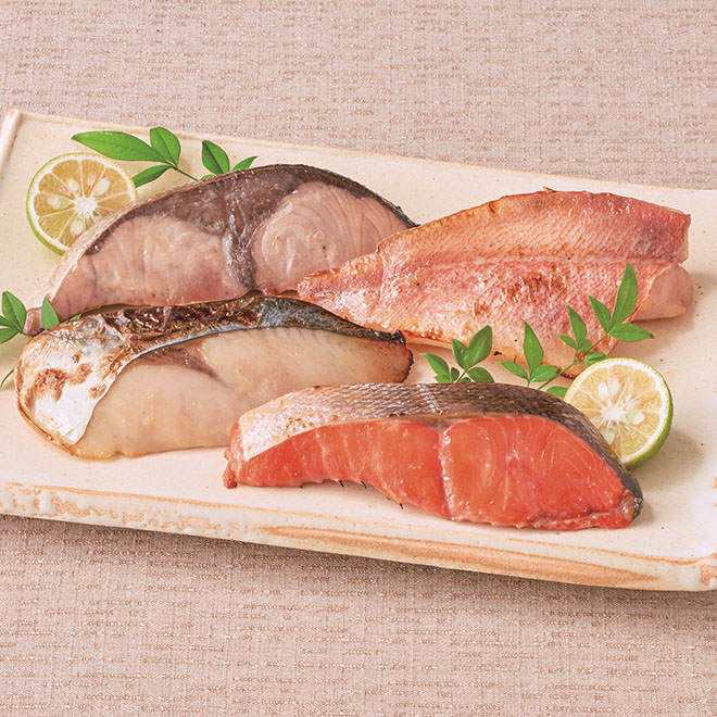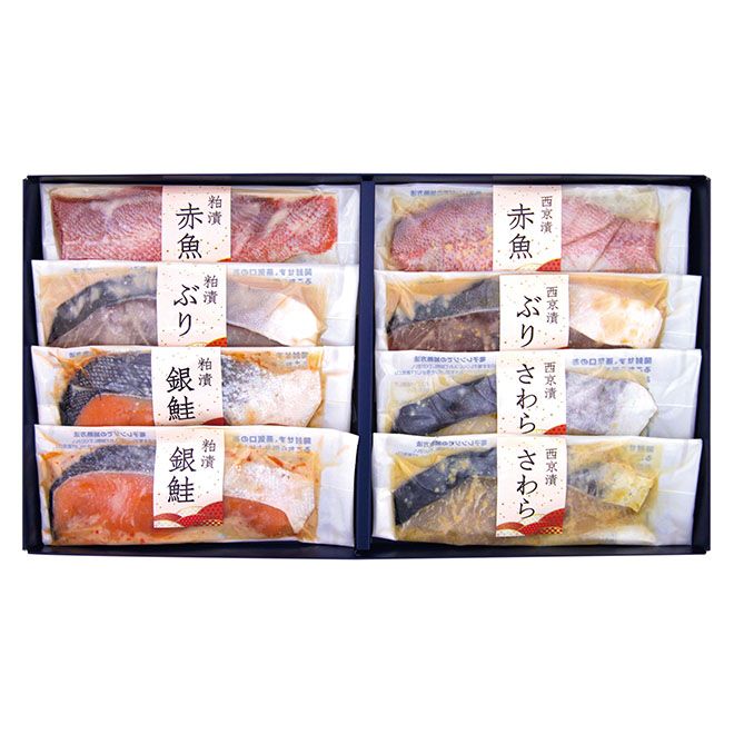 銀鮭粕漬・さわら西京漬 各60g×2切、赤魚粕漬、ぶり粕漬、赤魚西京漬、ぶり西京漬 各60g×1切 計8切
