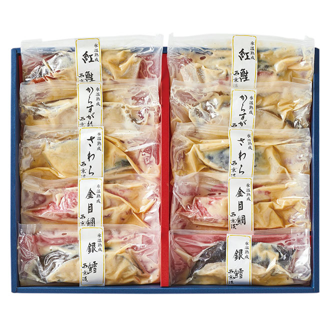 銀だら西京漬、金目鯛西京漬、紅鮭西京漬、鰆西京漬、からすかれい西京漬 各70g×2切 計10切