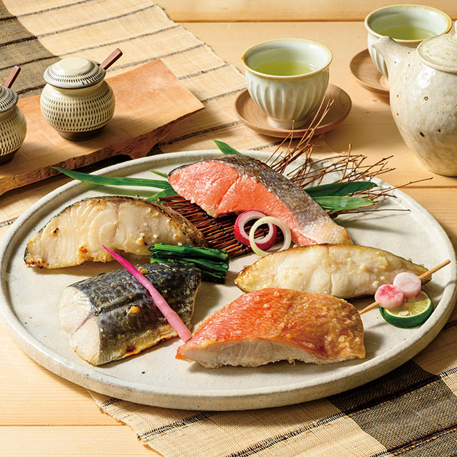 銀だら、紅鮭など5種類の魚を、当社特製n上品な甘みの味噌でじっくり氷温熟成。素材の旨味を引き出した西京漬けのギフトセット。