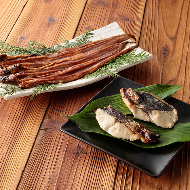 瀬戸内海で獲れた脂ののった真穴子と岡山県産の鰆の味噌漬けを贅沢にセットしました。