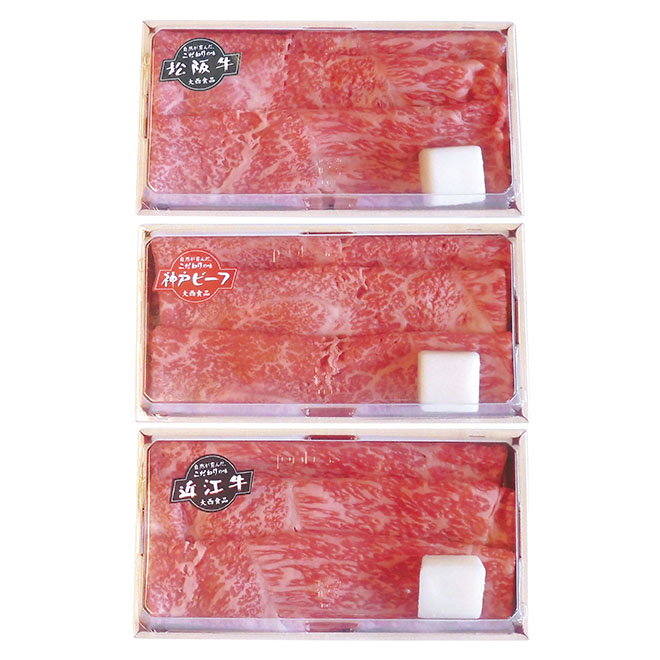 日本三大銘柄牛の松阪牛・神戸ビーフ・近江牛の食べ比べセットです。