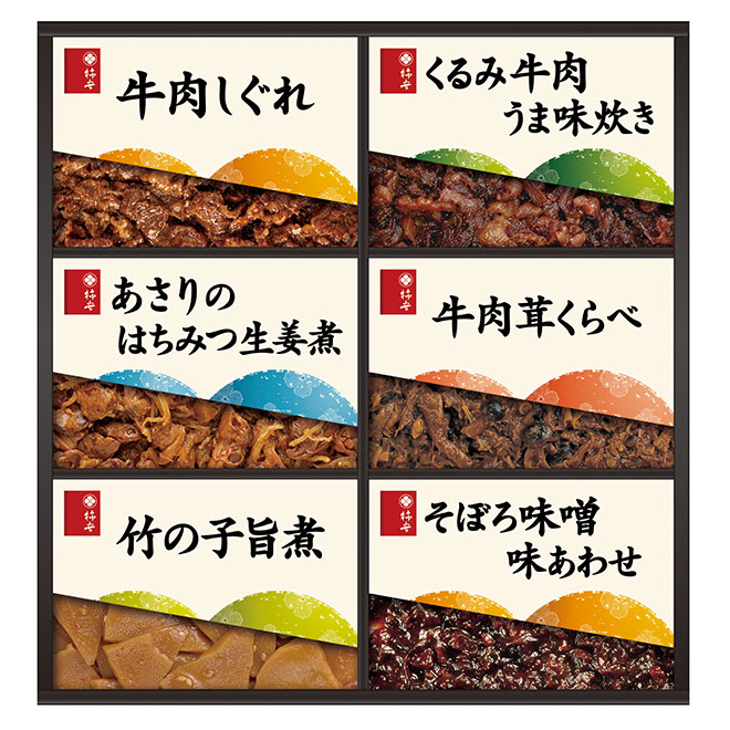 牛肉しぐれ50g、くるみ牛肉うま味炊き50g、牛肉茸くらべ50g、竹の子旨煮50g、あさりのはちみつ生姜煮40g、そぼろ味噌味あわせ90g