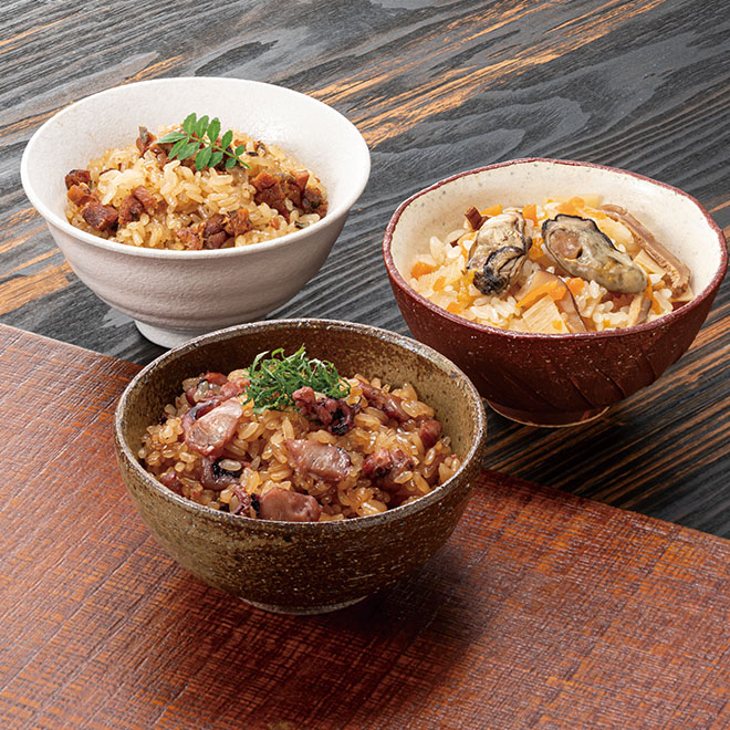 レンジで5分の簡単調理で、熱々の炊き込みご飯をお楽しみいただける商品です。海鮮具材に合わせた出汁が旨さの秘訣です。