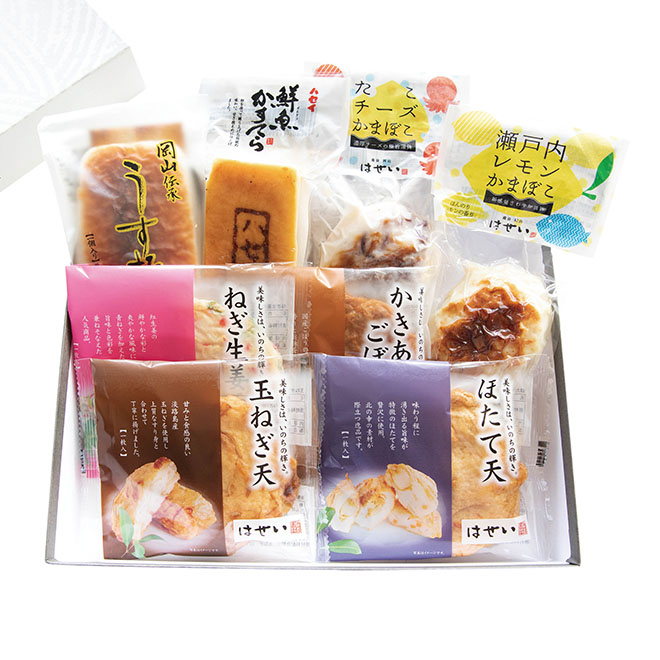 上うす板(中)、鮮魚かすてら半角(真空)、瀬戸内レモンかまぼこ(真空)、たこチーズかまぼこ(真空)、玉ねぎ天、ほたて天、ねぎしょうが天、かきあげごぼう天 各1個