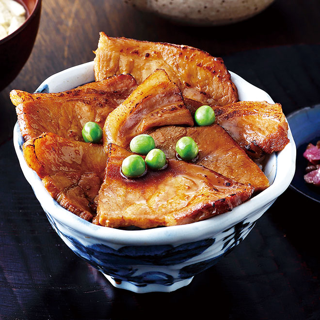 「豚丼」は北海道・帯広で古くから愛されてきました。ロースとバラ肉を程よい厚さにカットし炙りを入れて特製タレと合わせる事で肉の旨味・脂の甘みに香ばしさ、甘辛の味わいが加わりご飯との相性も抜群です。