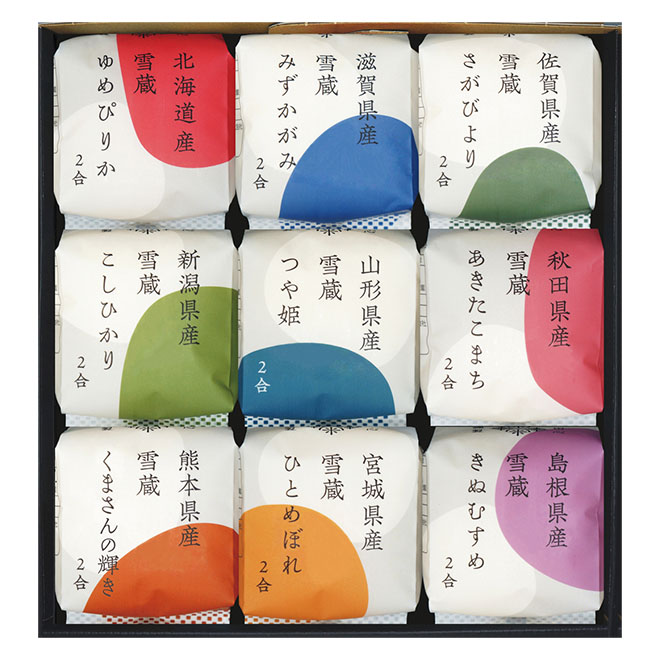 北海道産ゆめぴりか300g(2合)、滋賀県産みずかがみ300g(2合)、佐賀県産さがびより300g(2合)、新潟県産こしひかり300g(2合)、山形県産つや姫300g(2合)、秋田県産あきたこまち300g(2合)・熊本県産くまさんの輝き300g(2合)、宮城県産ひとめぼれ300g(2合)、島根県産きぬむすめ300g(2合)