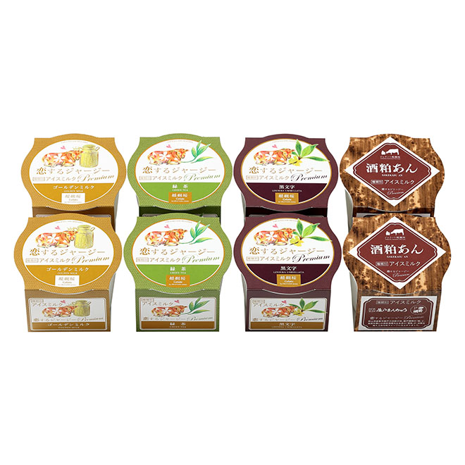 恋するジャージーPremiumゴールデンミルク、恋するジャージーPremium緑茶、恋するジャージーPremium黒文字、恋するジャージーPremium酒粕あん 各120mL×2個ずつ