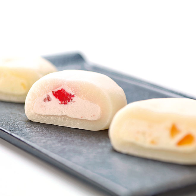 ふわふわのお餅の中にレアチーズ風味のクリームと生クリームを合わせ、中にそれぞれの果肉を入れた洋風大福です。