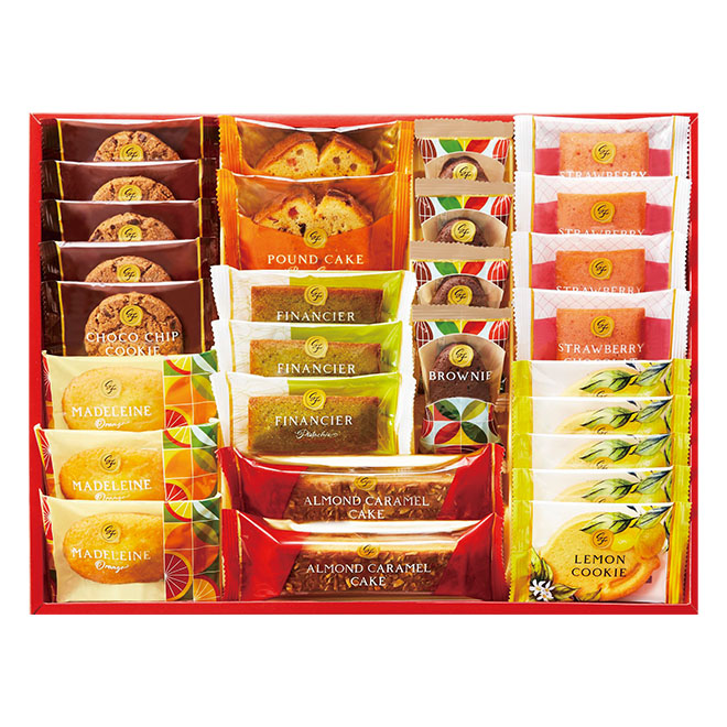 ブラウンシュガーパウンドケーキ、アーモンドキャラメルケーキ 各2個、オレンジマドレーヌ、ピスタチオフィナンシェ 各3個、ストロベリーショコラケーキ、ブラウニー 各4個、チョコチップクッキー、レモンクッキー 各5個